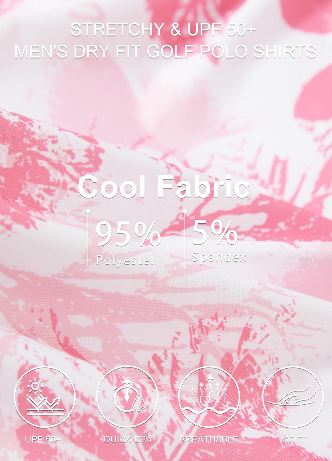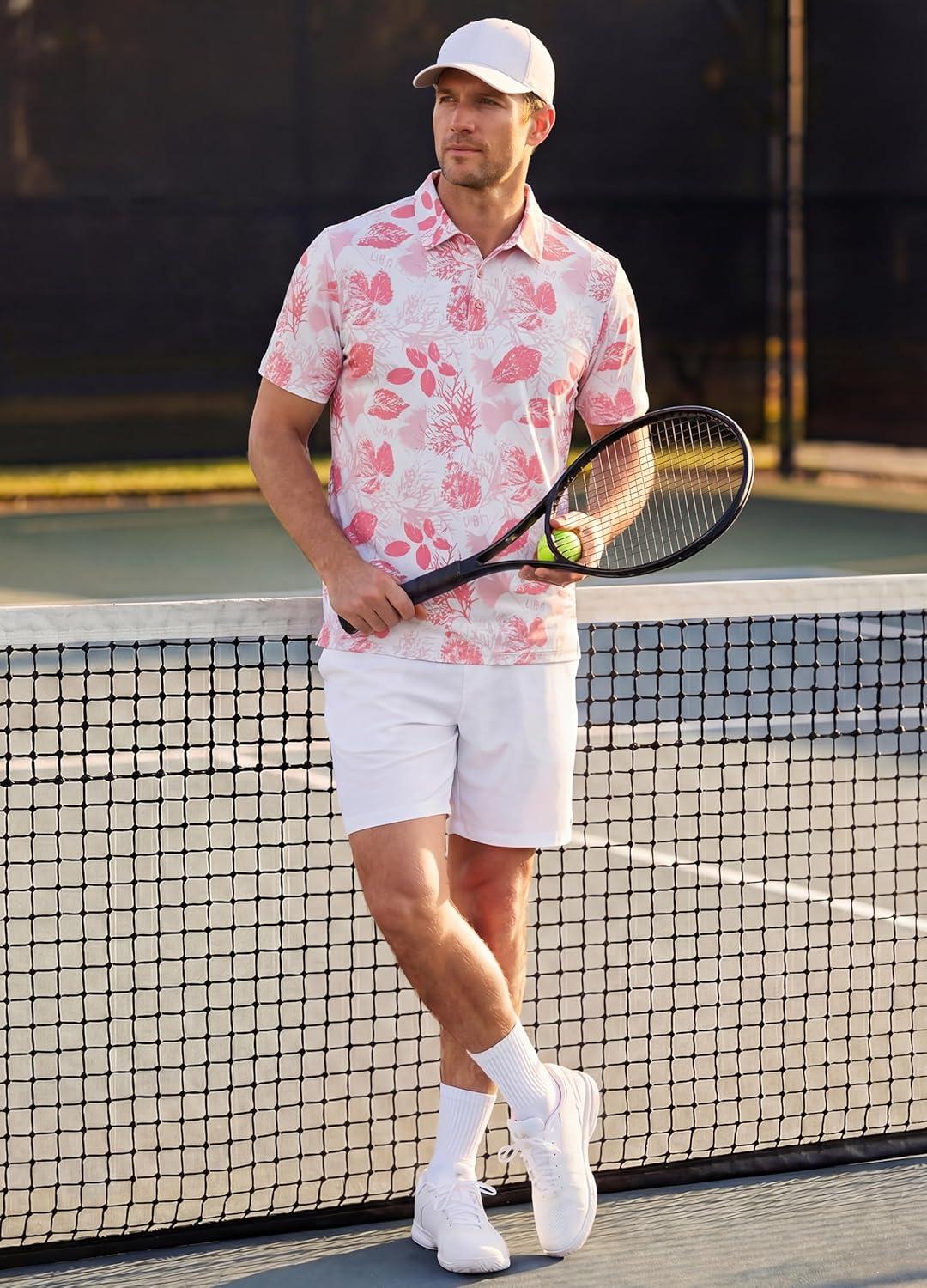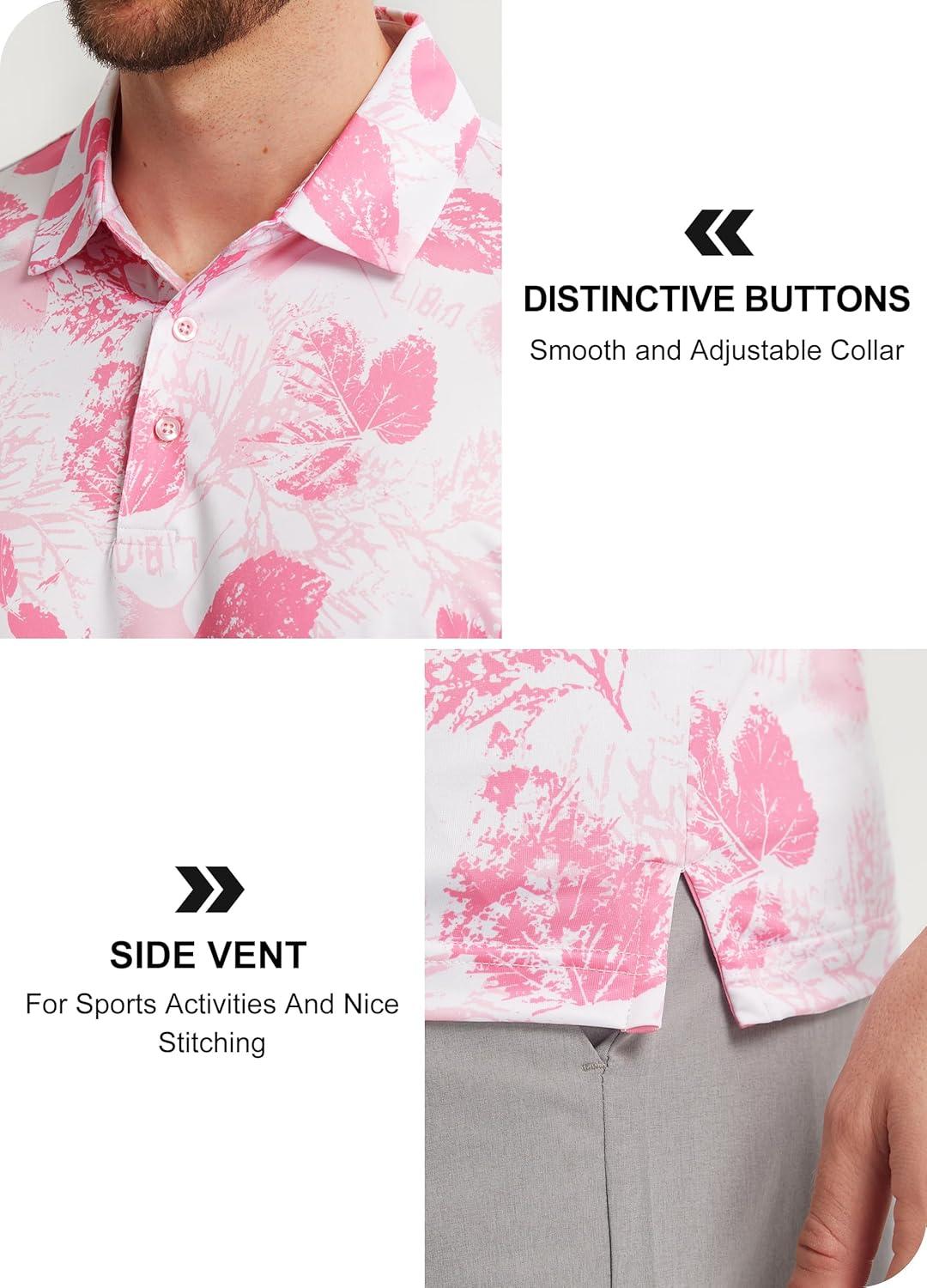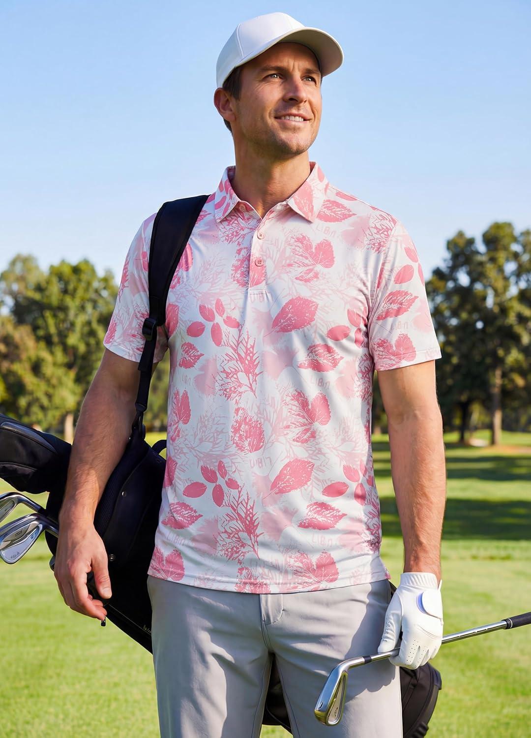 Libin Golf Polo Shirts for Men Short Sleeve Quick Dry Performance Moisture Wicking Print Collared Golf Shirts Casual Business(10-white Pink Leaf)