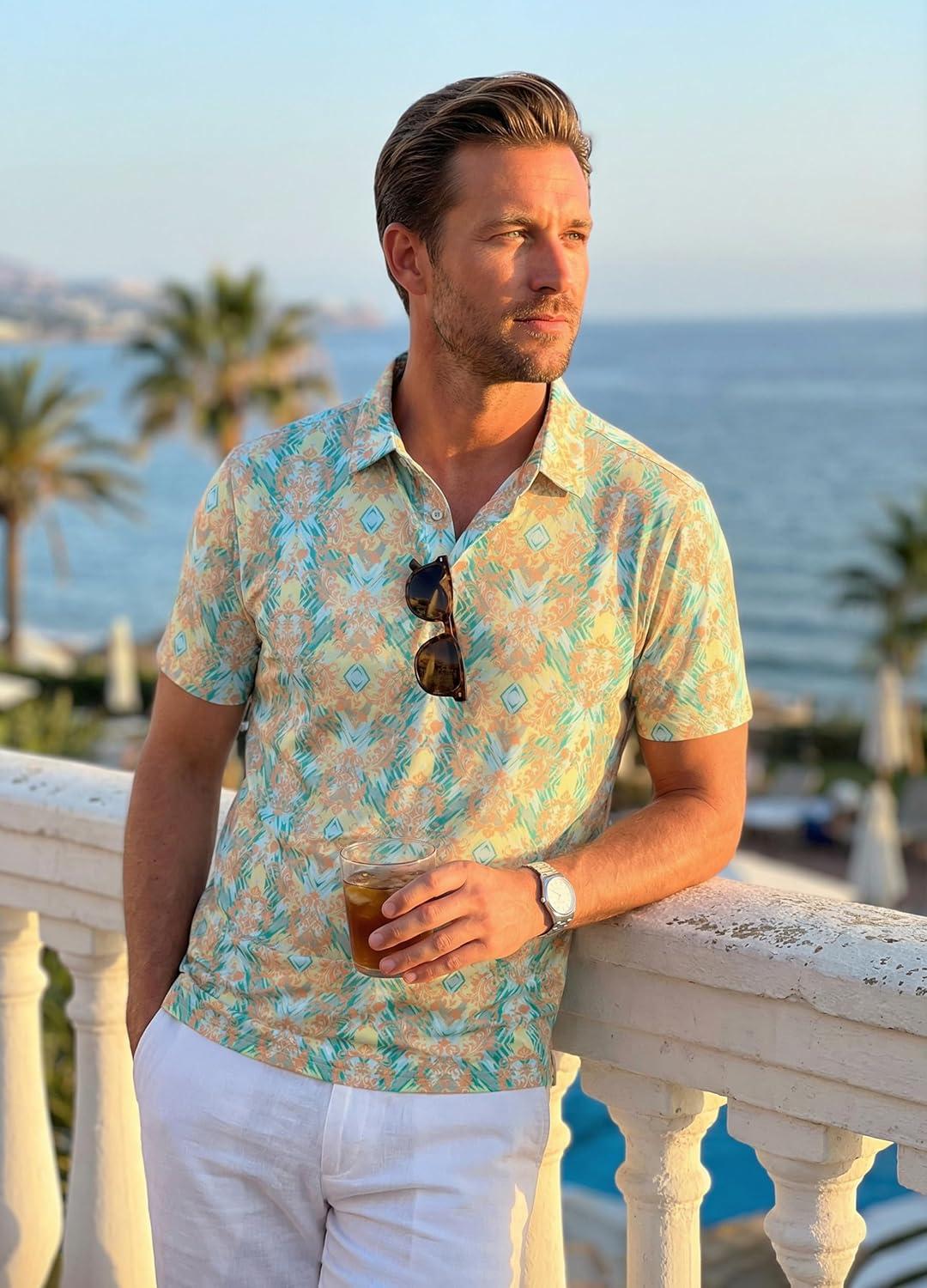 Libin Golf Polo Shirts for Men Short Sleeve Quick Dry Performance Moisture Wicking Print Collared Golf Shirts Casual Business(White Pink Leaf)